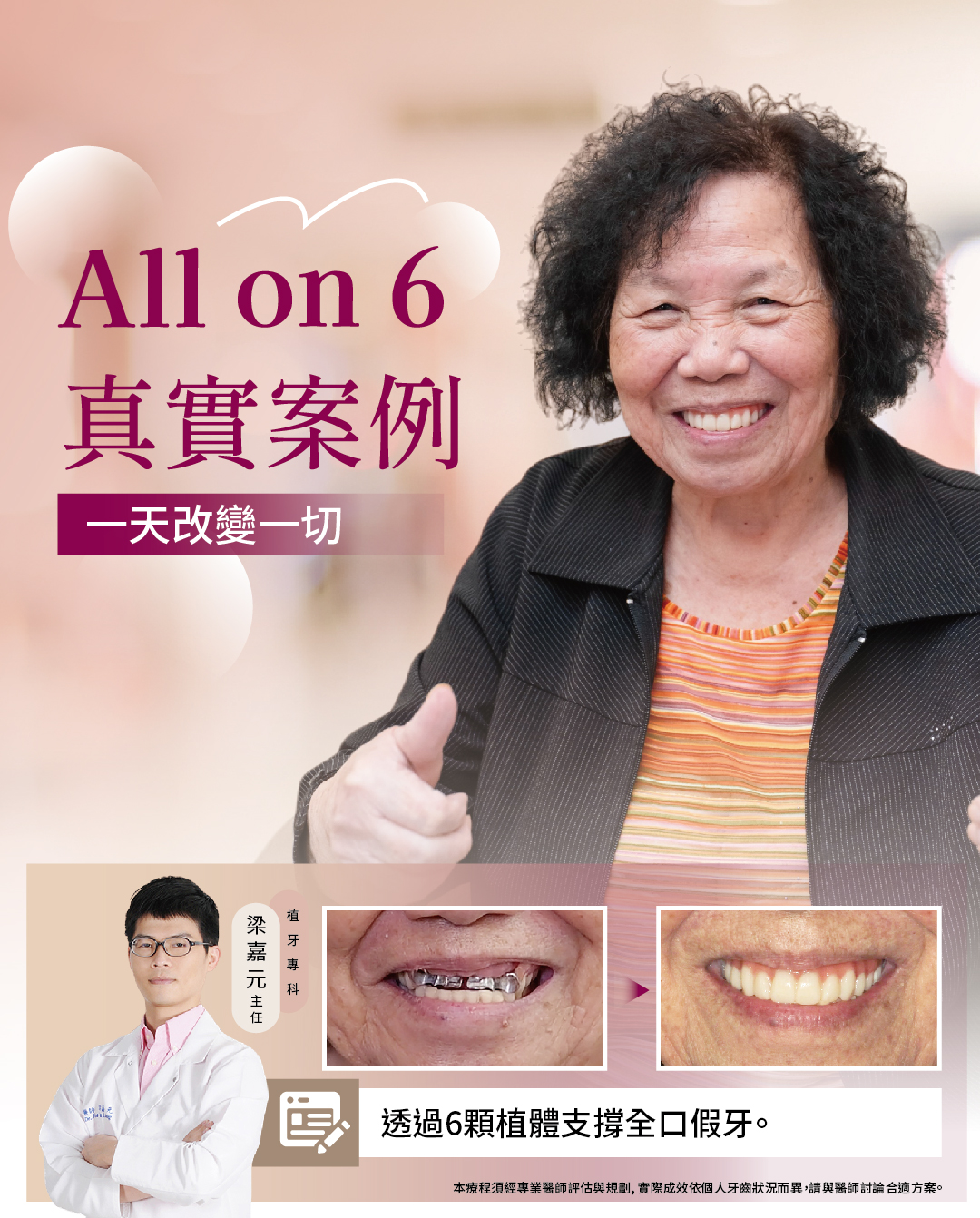 在這樣的背景下,她和家人決定要做全口重建,考量到她的需求,我們建議採用 All-on-6 一日全口重建 的方式,這是一種利用六顆植體作為支撐,快速完成全口固定假牙的療程,對於像她這樣牙齒缺失嚴重、希望能夠在短時間內恢復咀嚼和美觀的患者,非常合適。